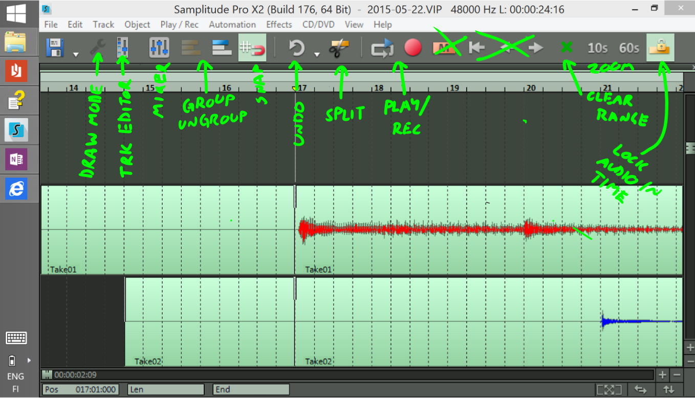 To maximize the space for manipulating audio, I have removed all the visual elements that are not absolutely essential. The Windows 8.1 task bar I’ve moved to the left side of the screen to free some vertical space. The onscreen keyboard is accessible from the task bar all the time. Naming tracks and saving files still requires some typing. I’m trying to fit the frequently used actions on a single toolbar so I’ve removed the toolbar at the bottom. Samplitude has a Big Toolbar option which makes the icons just the right size for touch.